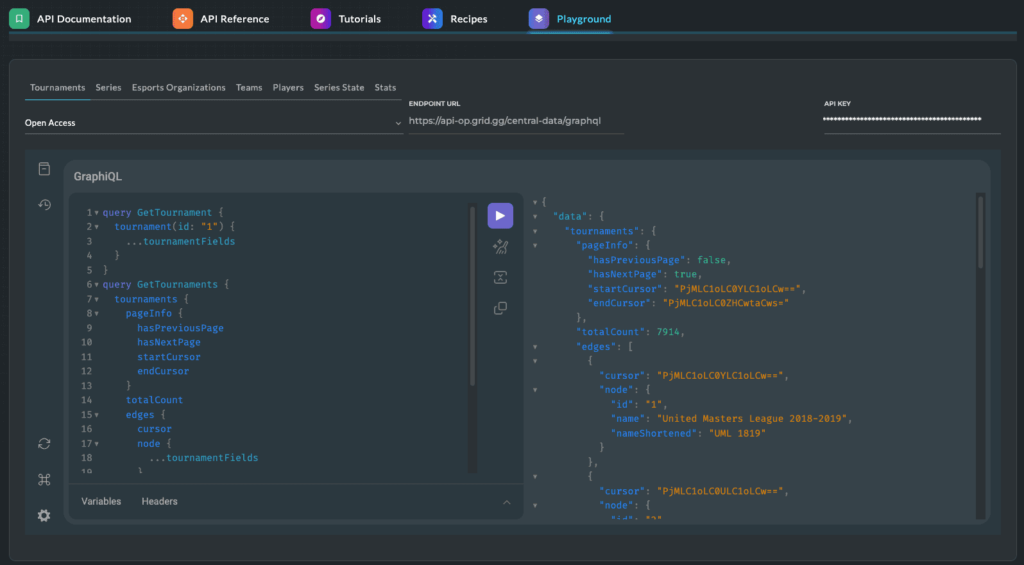 The API calls for Tournaments, Series, Esports Organizations, Teams, Players, Series States, and Stats can be visualized, edited, and tried with all their options and parameters in a safe and user-friendly environment, with all the latest capabilities powered by GraphQL.