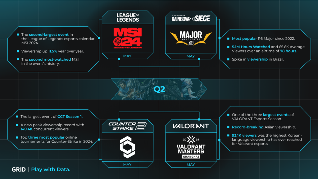 Welcome to the Q2 wrap-up on the GRID. We had a record quarter, with some of the most important esports events from each of the titles available on the GRID Data Platform taking place in Q2 24 and breaking viewership records.