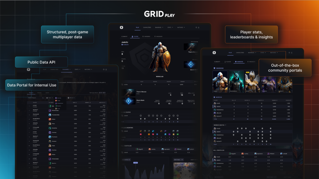 Game developers can extract, manage, and distribute pre-structured play data, gaining deeper insights into player performance and meta trends. GRID Play also provides engagement tools such as leaderboards, ranking systems, public managed APIs, and player stats, enhancing interactivity within gaming communities.